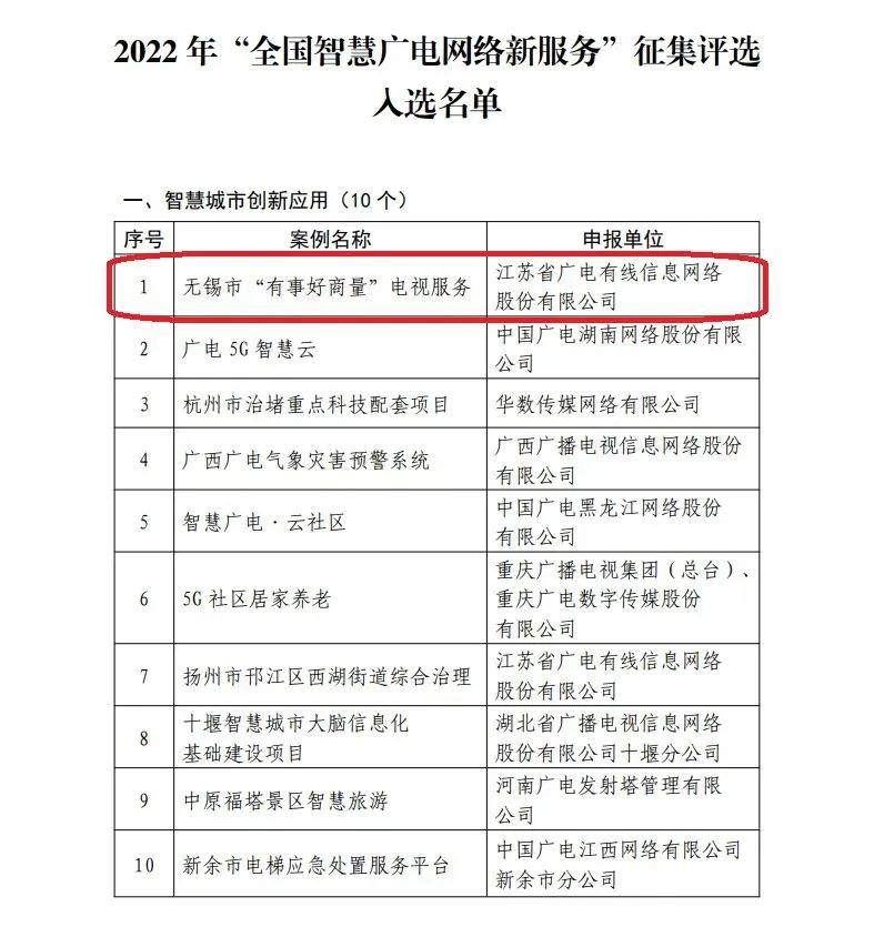 經(jīng)過復(fù)評和終評,由江蘇有線無錫分公司建設(shè)的無錫市“有事好商量”電視服務(wù)項目入選2022年“全國智慧廣電網(wǎng)絡(luò)新服務(wù)”之智慧城市創(chuàng)新應(yīng)用10佳案列,并位列首位。